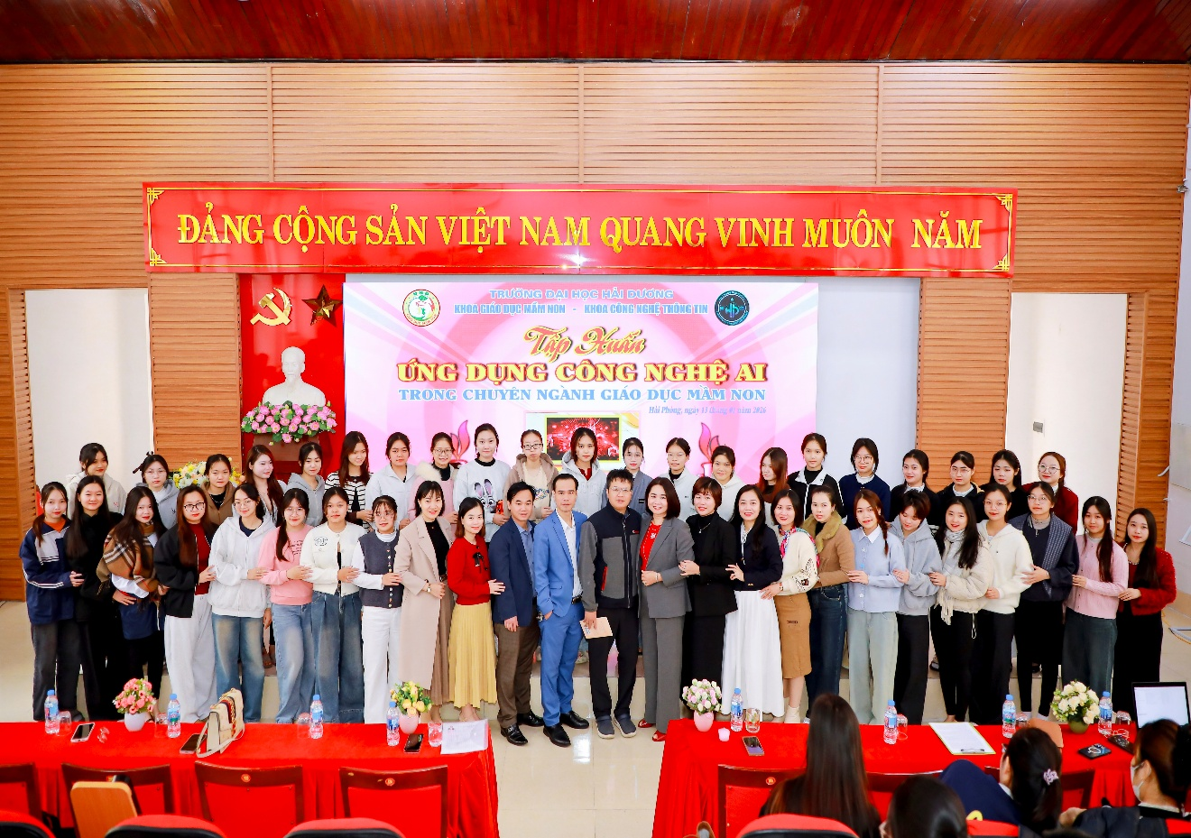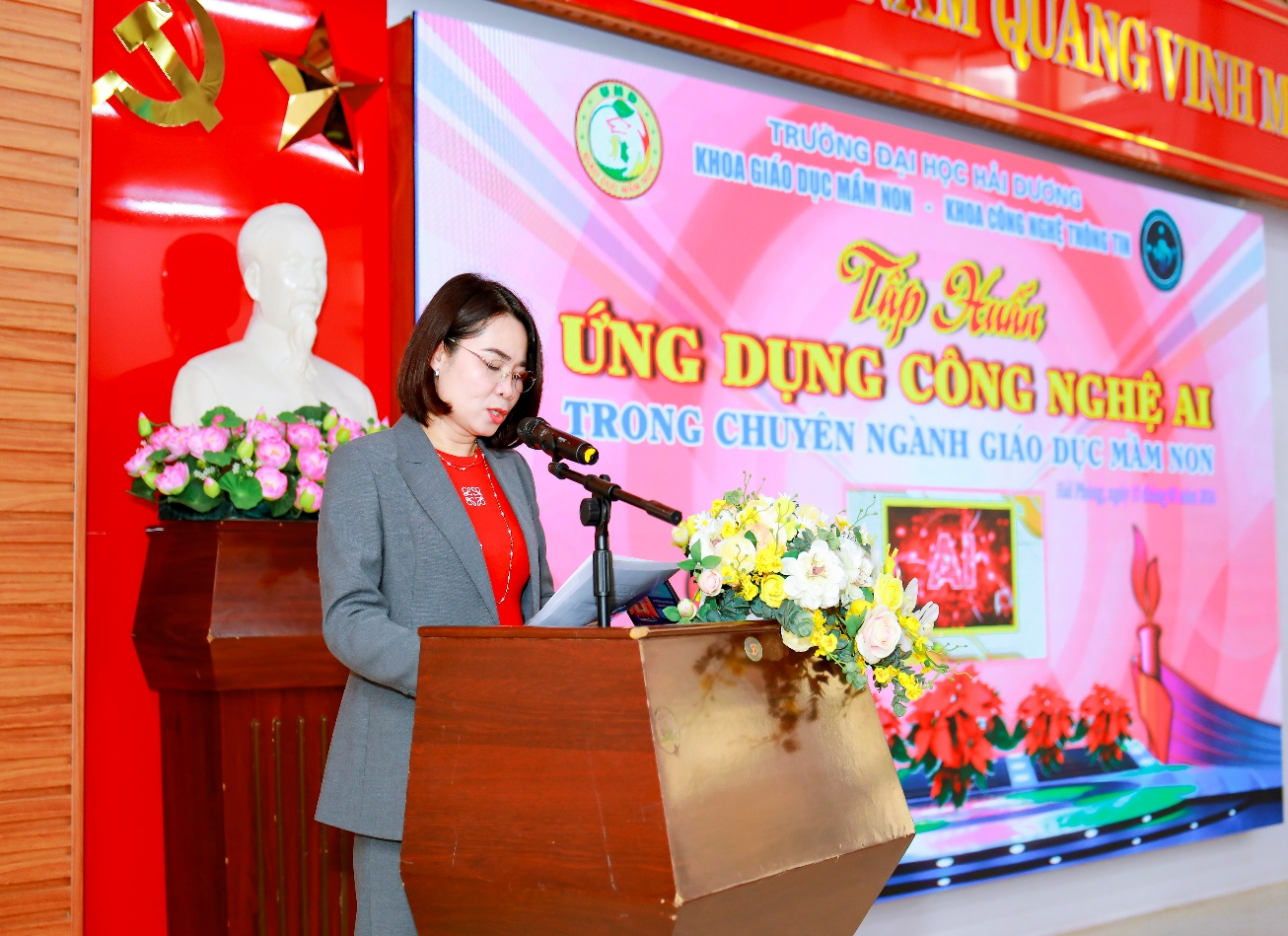 Xuất phát từ định hướng đổi mới căn bản, toàn diện giáo dục gắn với chuyển đổi số của ngành Giáo dục và Đào tạo, đồng thời cụ thể hóa tầm nhìn chiến lược trong đào tạo nguồn nhân lực chất lượng cao của Trường Đại học Hải Dương, sáng ngày 12/01/2026, tại Giảng đường 1 - Cơ sở 2 của trường Đại học Hải Dương, Khoa Giáo dục Mầm non đã phối hợp với Khoa Công nghệ Thông tin tổ chức chương trình tập huấn với chủ đề: “Ứng dụng công nghệ AI trong chuyên ngành Giáo dục Mầm non”.