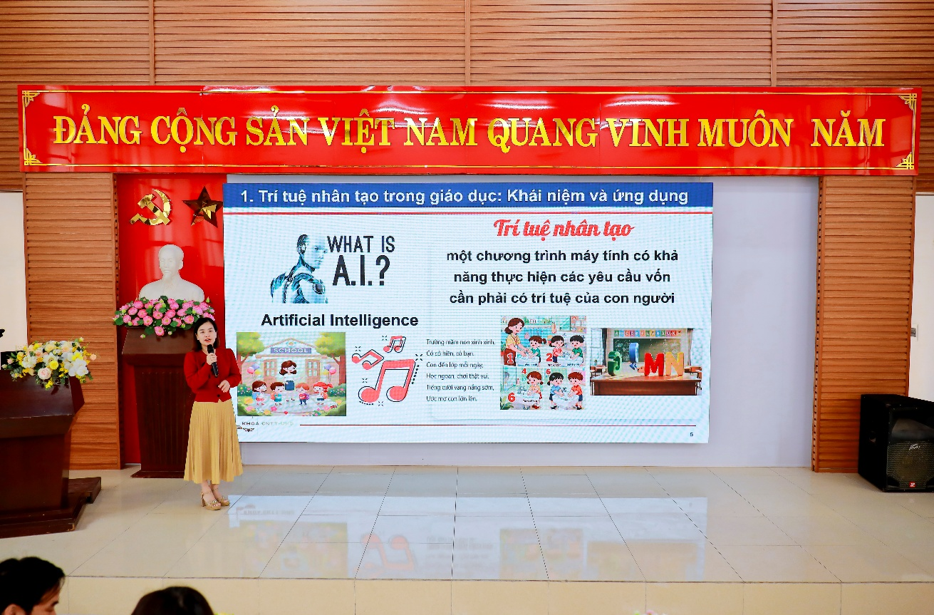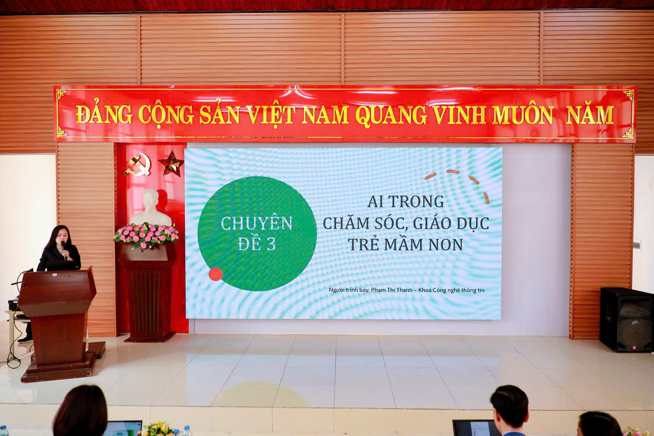 Chuyên đề 1: “Trí tuệ nhân tạo và ứng dụng trong Giáo dục Mầm non” do cô Phạm Thị Loan - Phó Trưởng Khoa, phụ trách Khoa Công nghệ Thông tin trình bày đã cung cấp cái nhìn tổng quan về AI, các nguyên lý cơ bản và tiềm năng ứng dụng AI trong hoạt động đào tạo, chăm sóc và giáo dục trẻ mầm non.