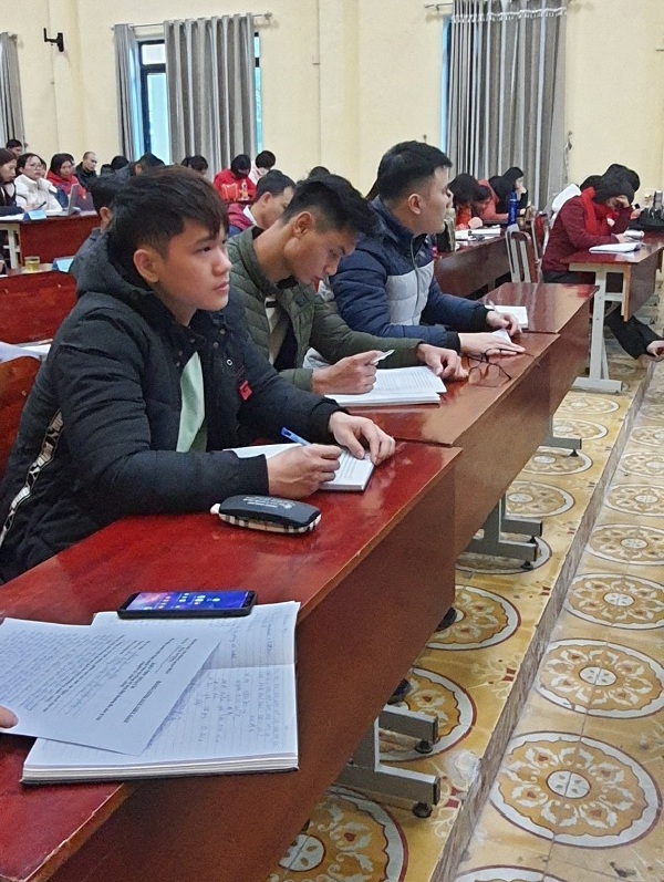Các đảng viên trẻ là sinh viên nghiêm túc học tập, ghi chép các nội dung cơ bản của Nghị quyết