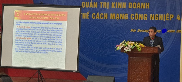 TS. Vũ Đức Lễ - Bí thư Đảng ủy Trường Đại học Hải Dương trực tiếp truyền đạt các nội dung cơ bản Nghị quyết Đại hội Đảng bộ tỉnh Hải Dương lần thứ XVII, nhiệm kỳ 2020-2025